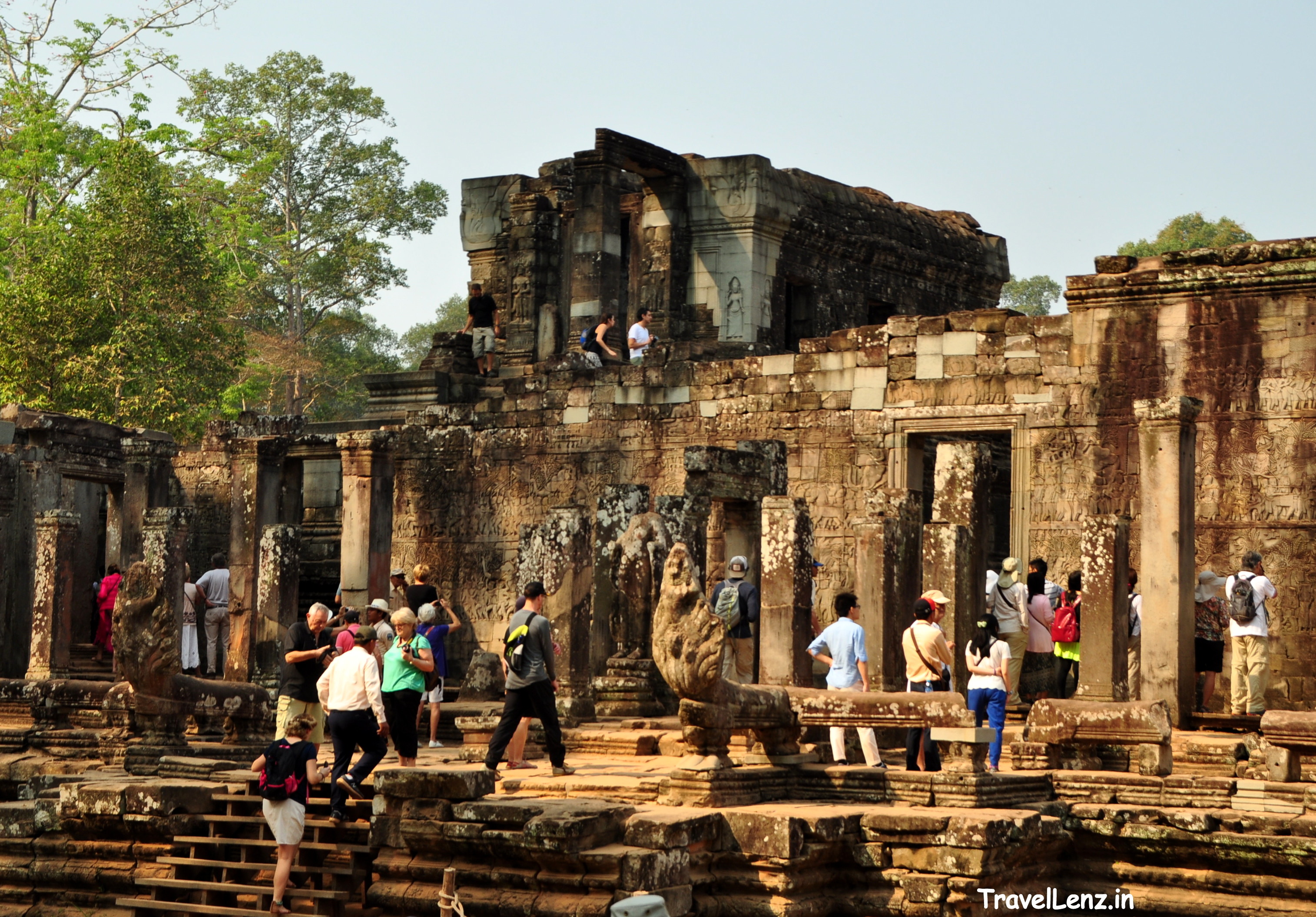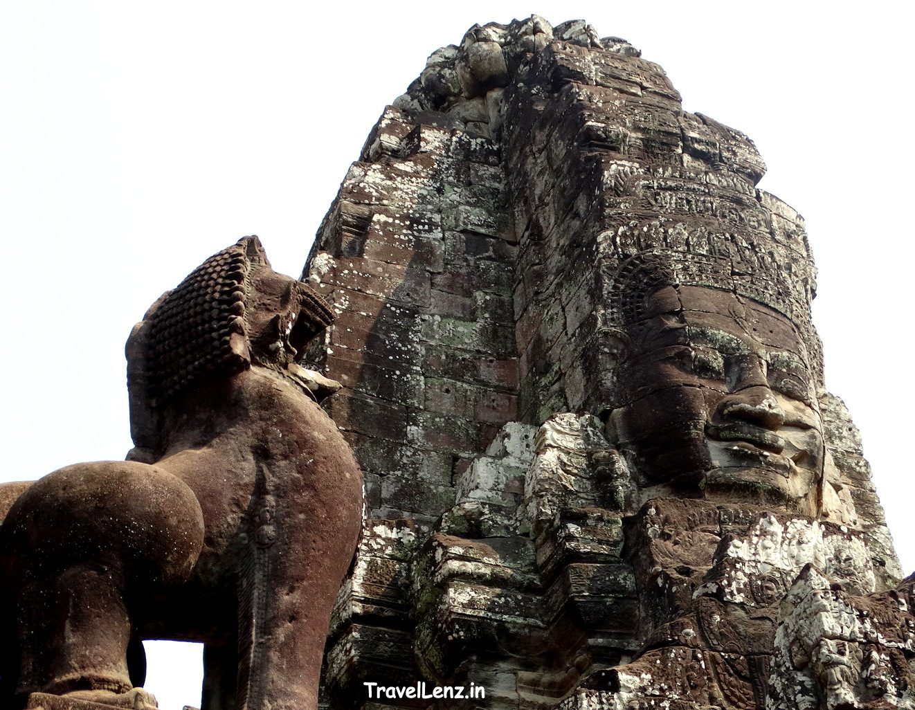 As we walked towards the temple, we realised that the Bayon temple was not just about the mysterious smiling faces. We climbed a few steps to reach a large terrace that was adorned by guardian lions and Naga (snake) balustrades. All the Khmer temples in Cambodia and Thailand have Naga bridges and guardian lions.