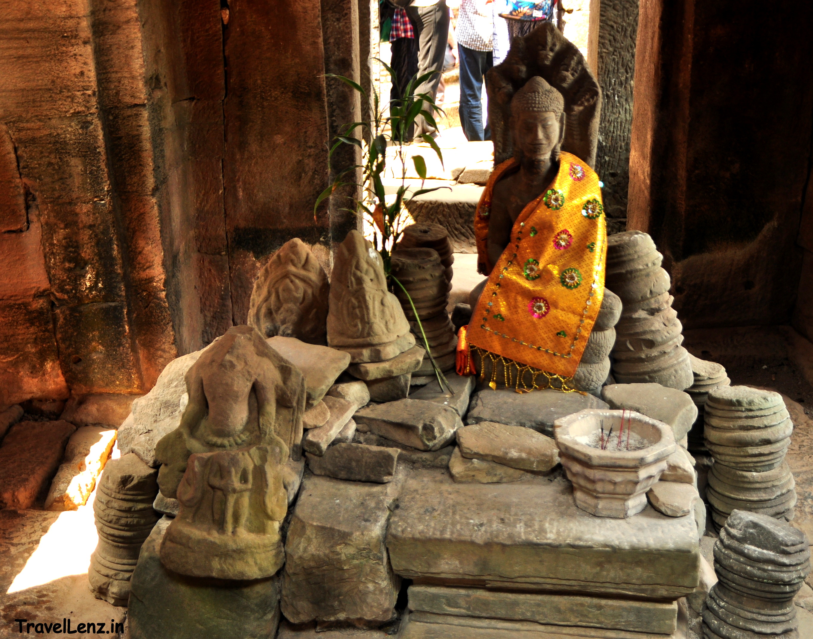 Bayon was built as a Buddhist temple. We found a statue of a seated Buddha sheltered under the hoods of a snake in a shrine.