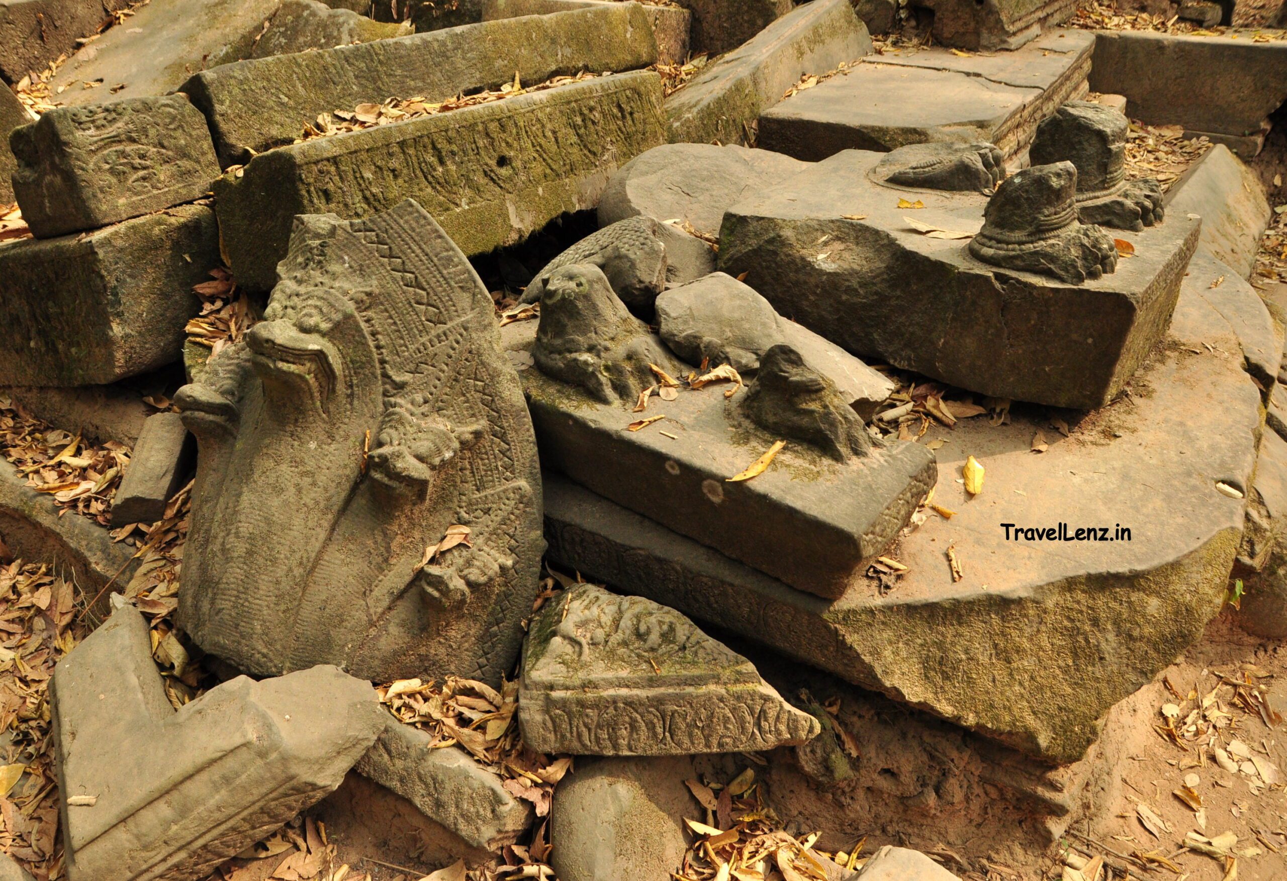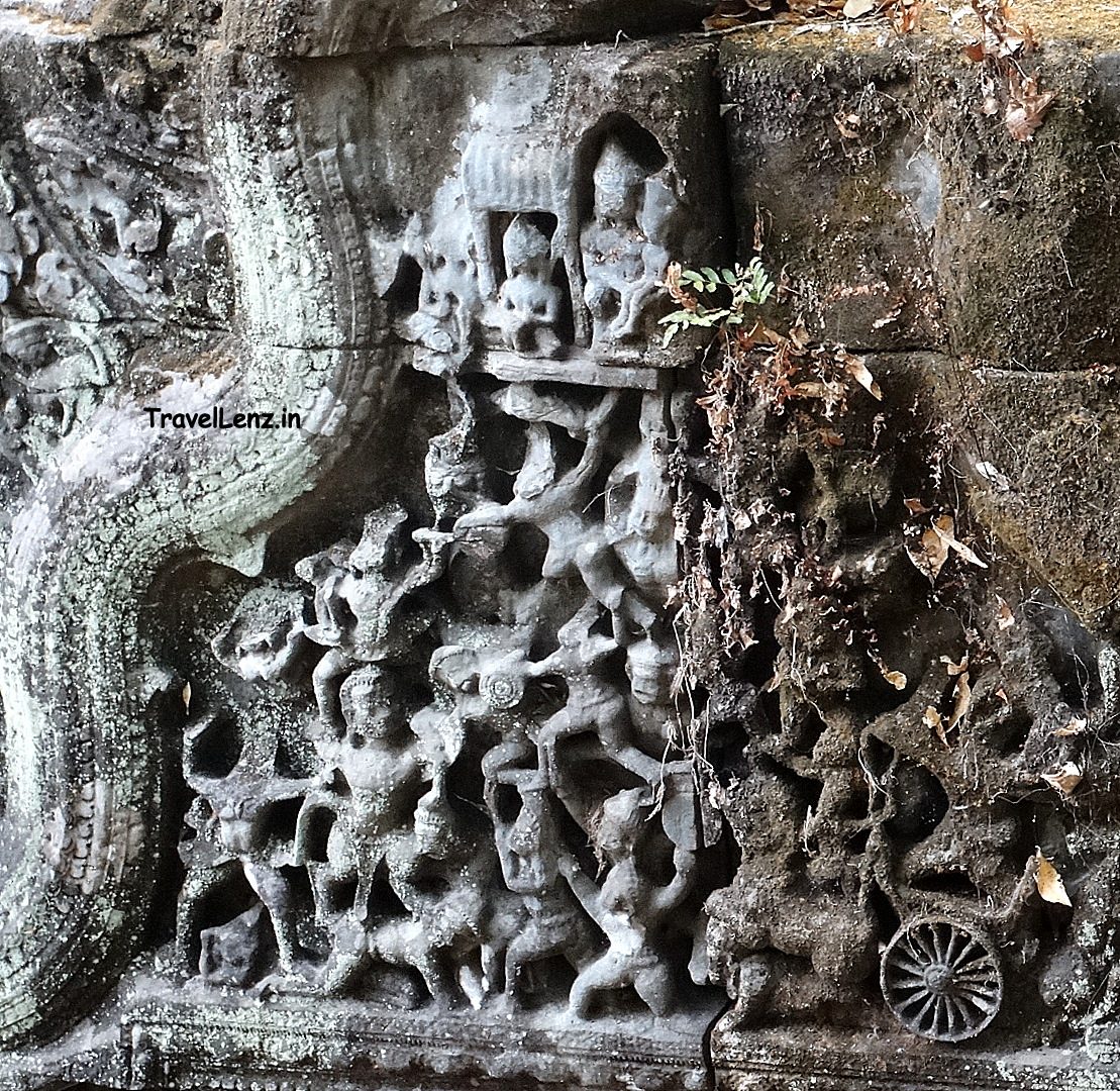 Pairs of feet that belonged to guardian stone lions lay among the fallen Naga heads, moss-covered stone blocks with intricate carvings of Hindu and Buddhist motifs, and pillar columns – it looked as though an earthquake had hit the region, unlike the real reason – the wear and tear of eight odd centuries. Or was it looters?