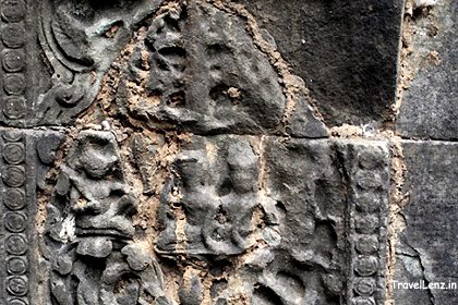 Another carving had Krishna fighting the Asura King, Bana. Krishna is seen here on top of Garuda on the left side, fighting with Banasura who is riding on a chariot drawn by lions on the right side. On the top right side in a palace balcony is Usha, Bana’s daughter, and Aniruddha, Krishna’s grandson. The couple were in love which Banasura did not approve and led to the fight.