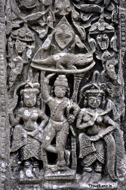 A pediment showing Sita’s Agnipareeksha (fire ordeal) was something that we had not seen anywhere in India. Sita was sitting with joined hands on a throne carried by Devatas. The throne was kept over a pyre. Lord Rama is also seen here flanked by Lakshmana to his right and Hanuman to his left. Sita had to undergo Agnipareeksha to prove her chastity due to her captivity in Ravana’s palace. Eventually, Sita came out of the fire unharmed proving her purity.