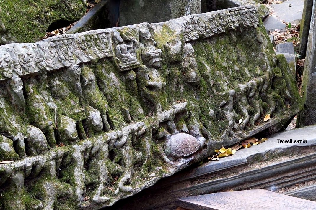 A carving depicting the churning of the ocean of milk and the ever-continuing conflict between the Devas and Asuras lay on the ground. It was a miniature version of what we had seen at the gates of Angkor Thom. There were the Devas (Gods) on one side and the Asuras (Demons) on the other side holding onto the Naga King, Vasuki, churning the ocean of milk using Mount Mandara as a whisk. The mythology centers around Lord Vishnu’s second Avatar (incarnation), Kurma (turtle), who bore the mountain on his back.