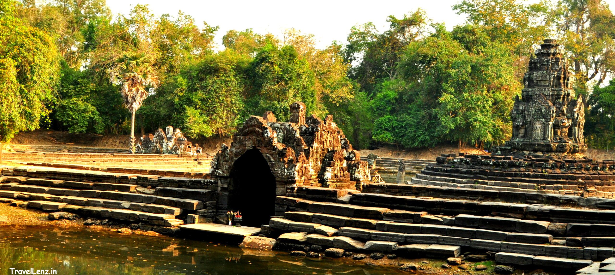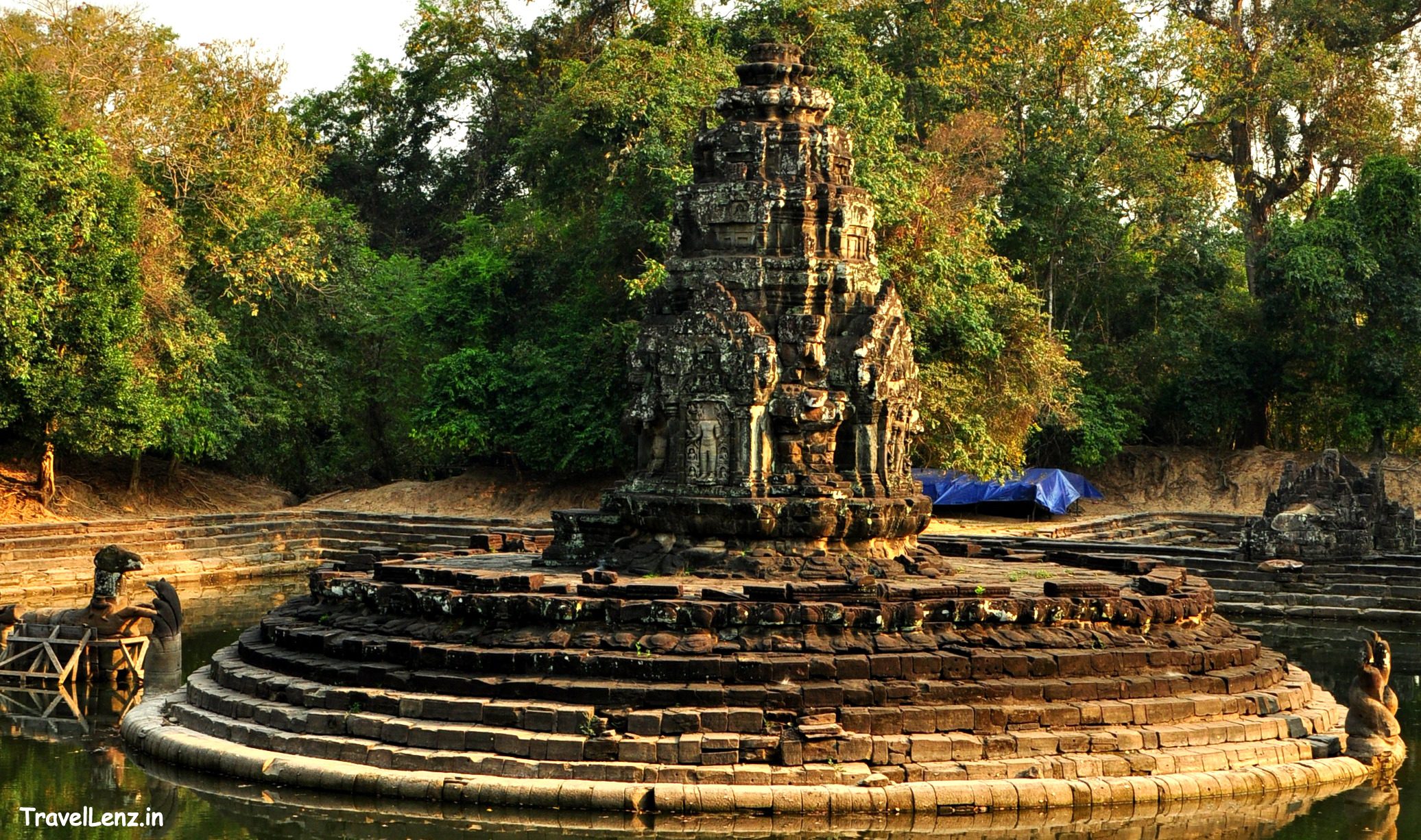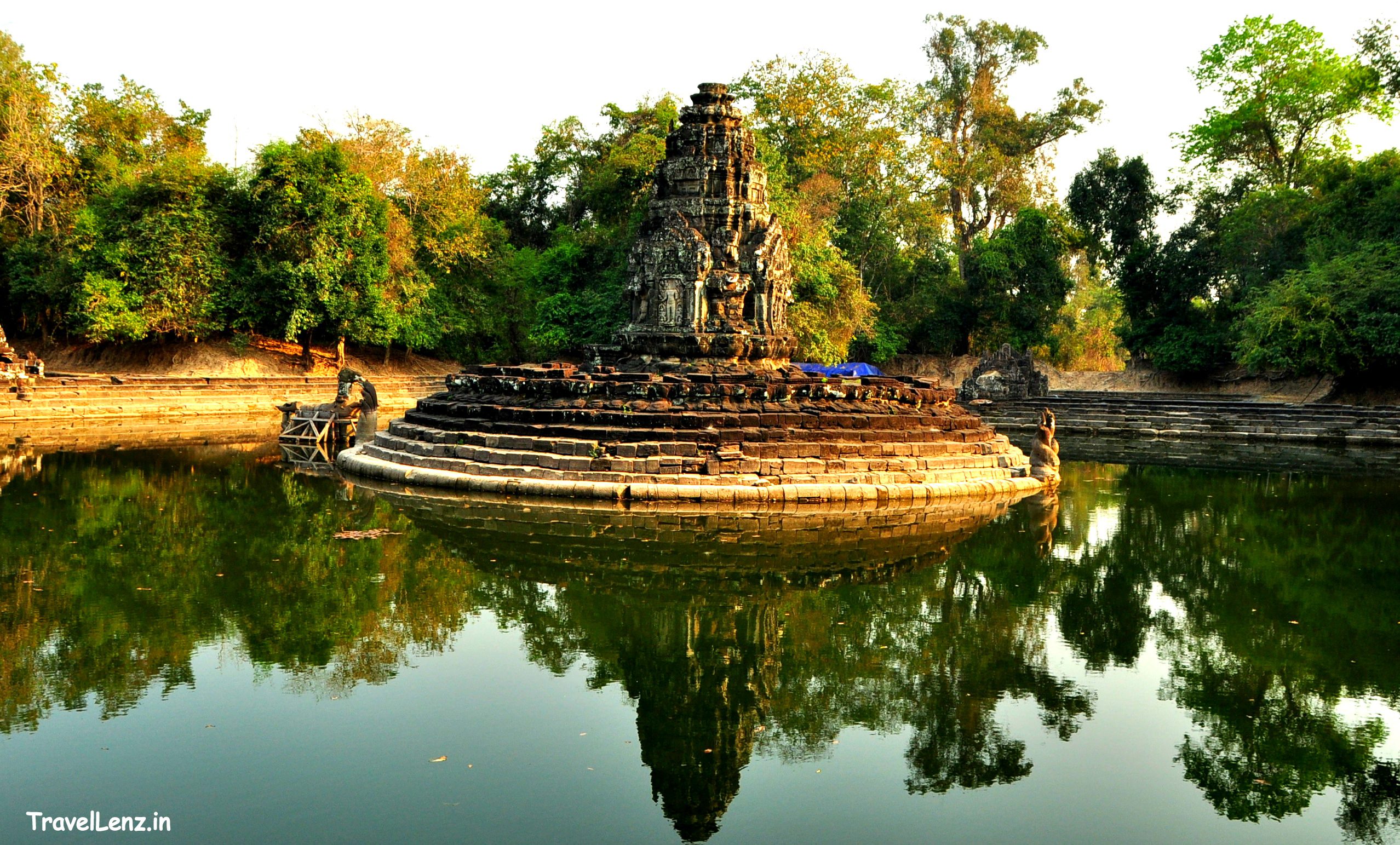 In the last two days, we had climbed over a number of laterite steps, sandstone platforms and posed against a few apsaras. What we were about to visit was entirely different from what we had seen these two days. Neak Pean is an artificial island temple situated in the middle of the Northern Baray. The temple had a picturesque setting and consists of a central pond surrounded by four smaller ponds.