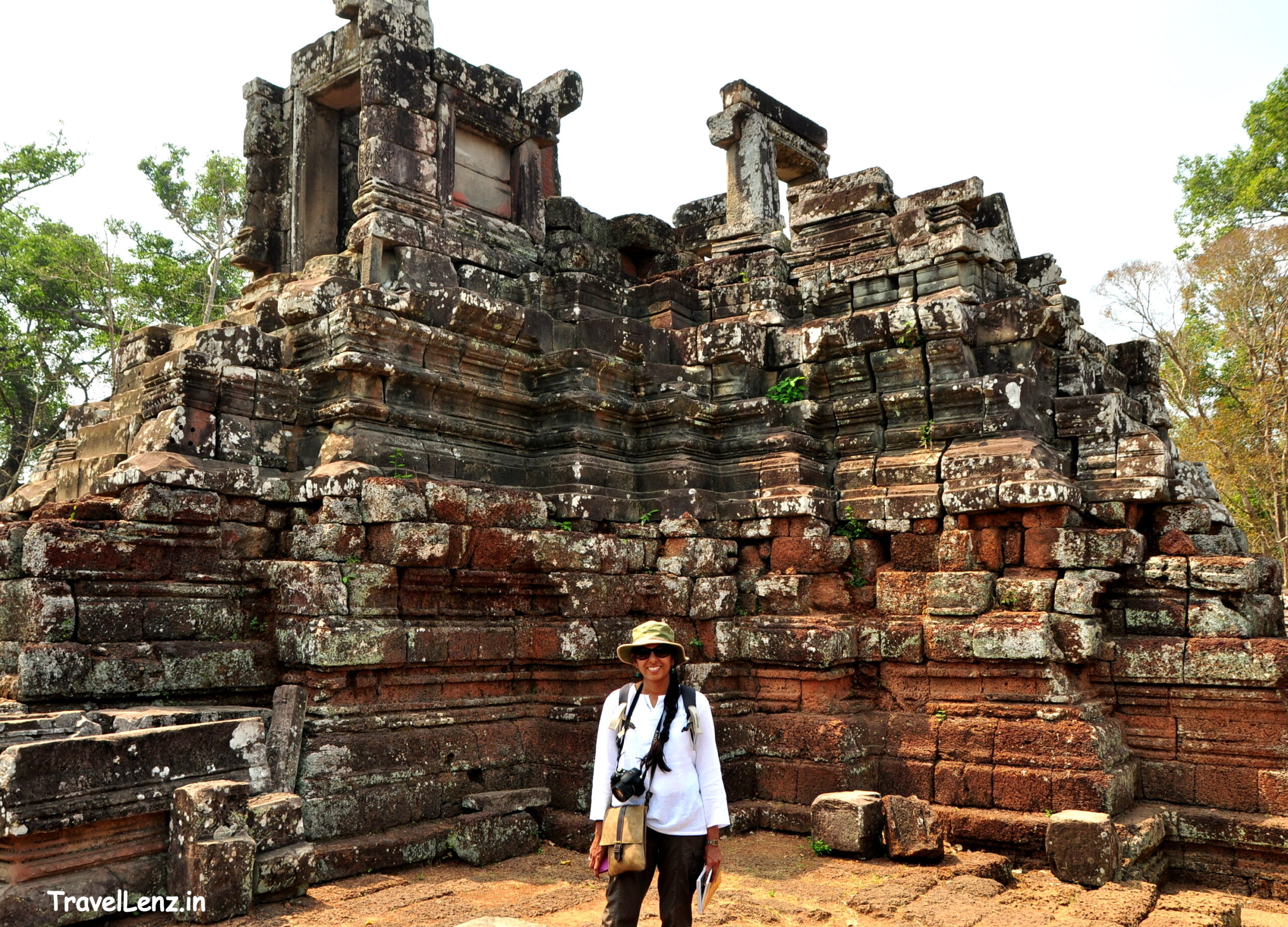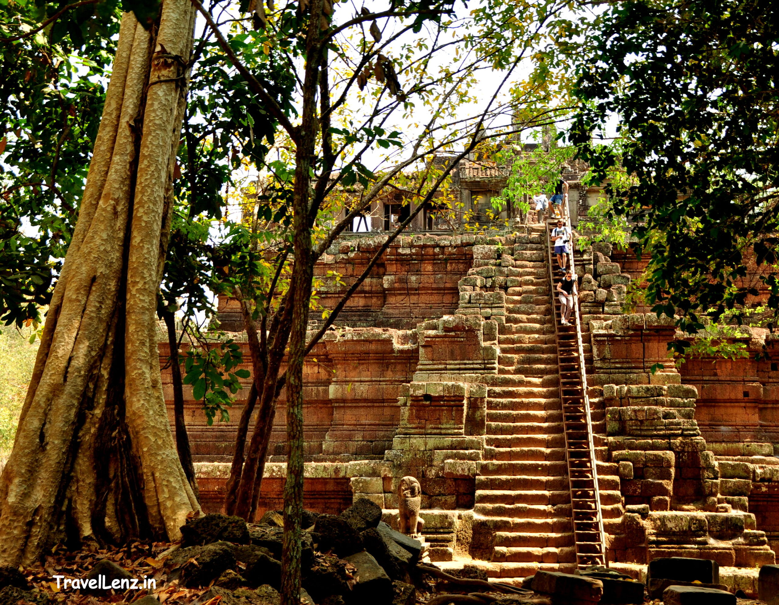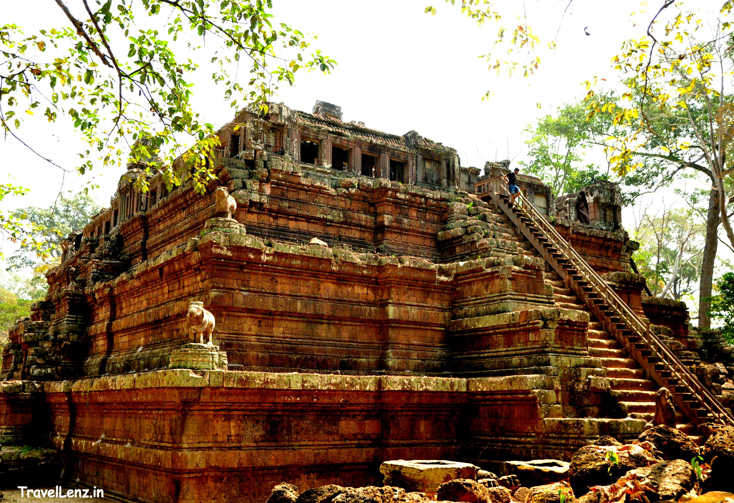 The central pyramid had laterite steps leading up on all four sides – all were in a crumpled condition. A wooden stair with railings had been constructed over the original laterite stairs on the western side. The stairs were flanked by guardian lions. There were stone elephants too, mostly broken, found at the corners of the pyramid. The temple was more than 30 metres in height.
