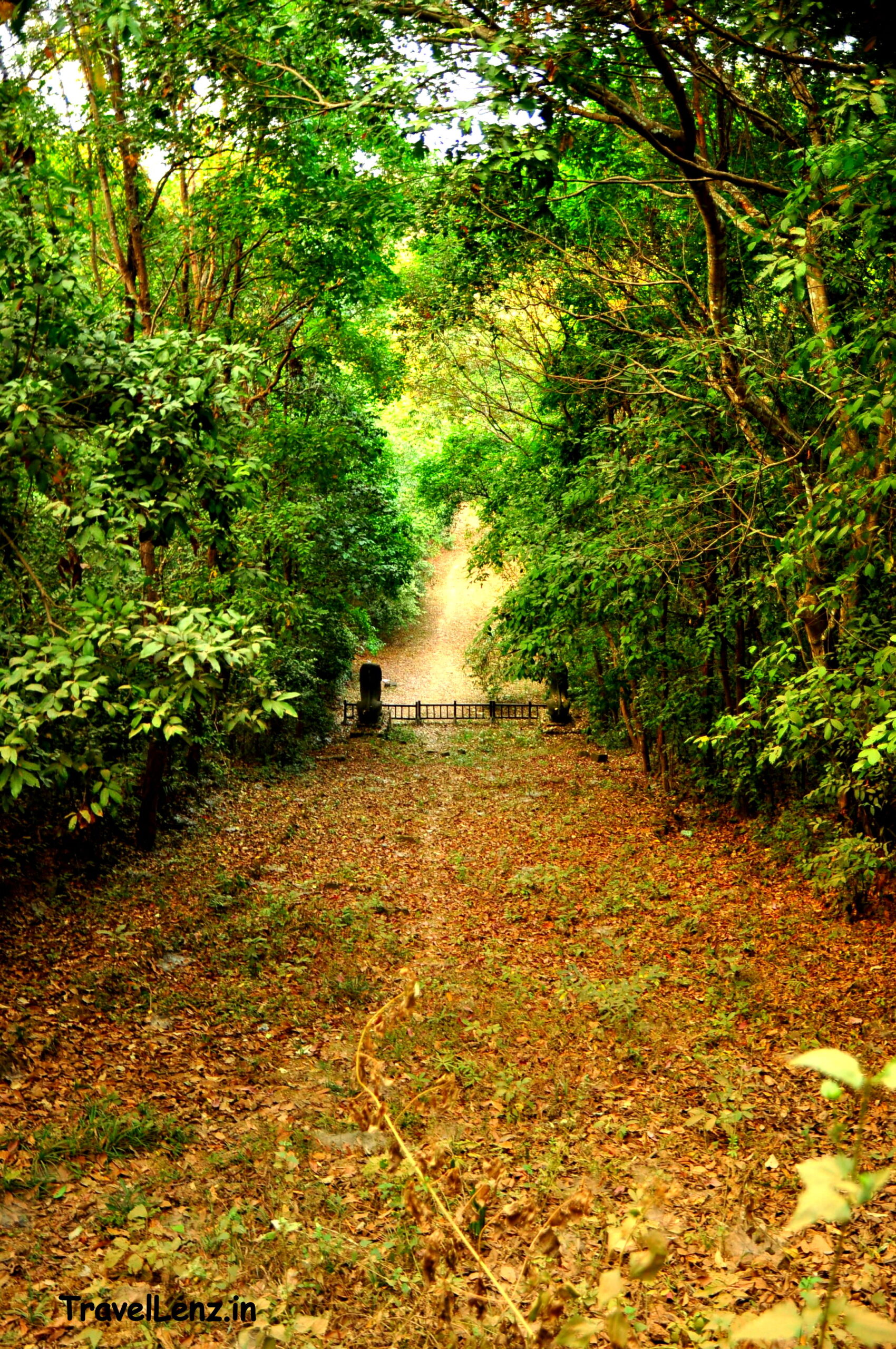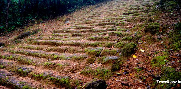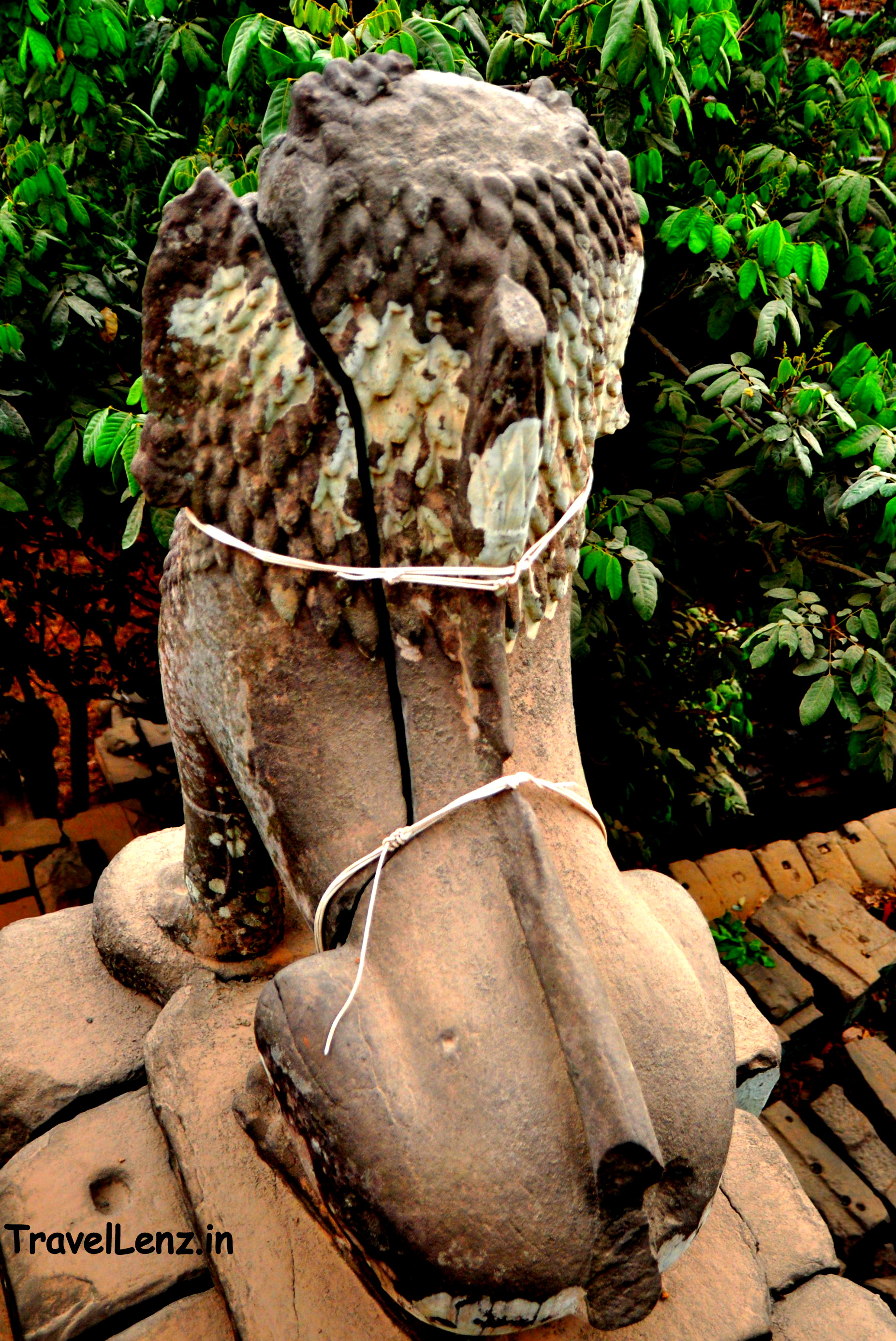 As we walked along the dirt track, we found a steep and dangerous flight of laterite steps that were cut onto the side of the hill. The stairs were leading up through a thick cover of trees. Tes said that these steps were part of the original route from the base to the top of Phnom Bakheng. Now, a barricade stands in front of it and the steps are closed to the public. Incidentally, laterite stairways lead up from three sides of the hill. At the eastern entrance, two large guardian lions stood guarding the steps.