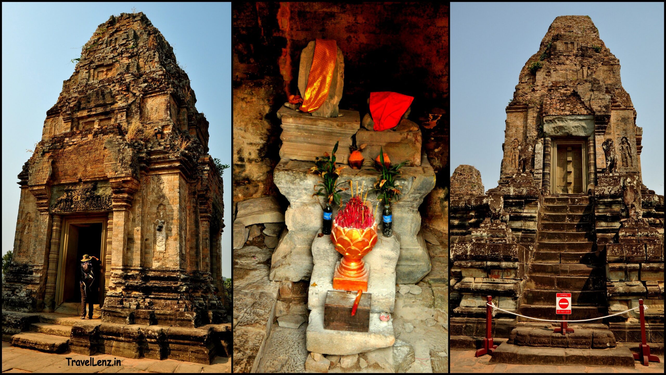 We climbed up the steep laterite steps to the top platform of Pre Rup to find five towers. Just like Angkor Wat, Pre Rup had five towers that were arranged in a quincunx, one at each corner of the square and one in the centre. There were deities carved on either side of all the tower’s eastern doors; the other three doors were false doors.