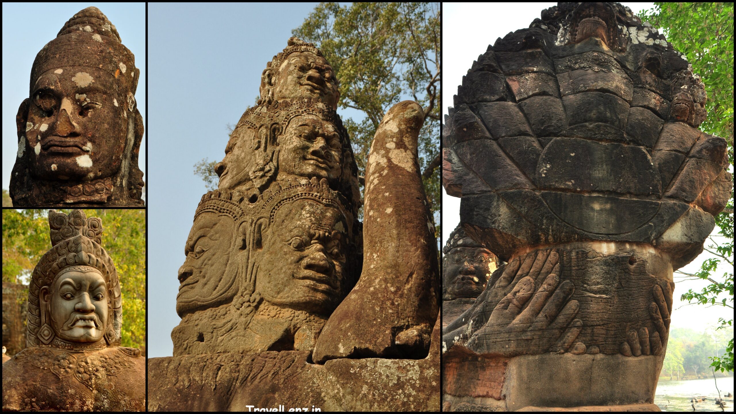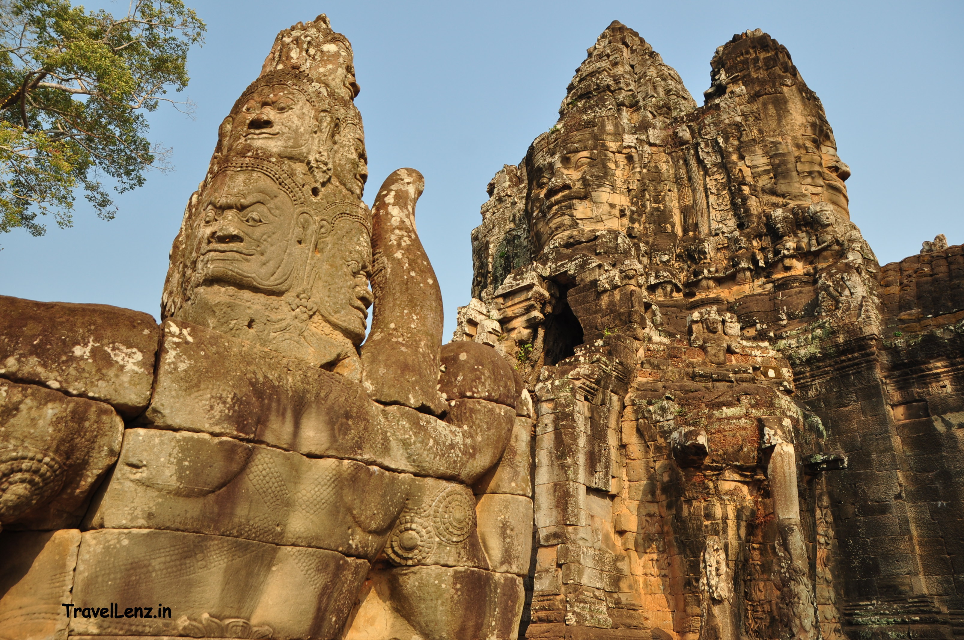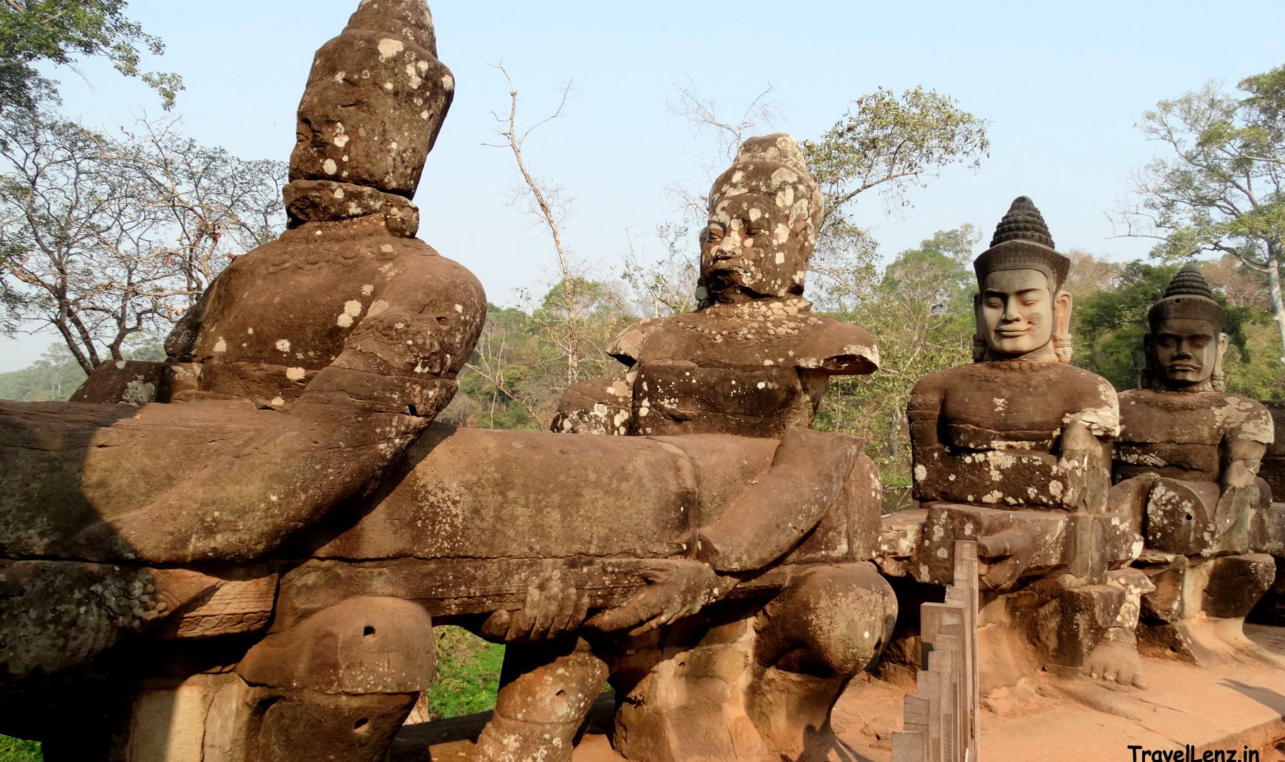 The south gate tower of Angkor Thom, Tes explained, was the most impressive of all the gates, the best preserved and the busiest of them all. We had to cross a bridge to reach the gate tower – the bridge that stood over a moat had a story in itself. For most Indians and those familiar with Hindu mythology, there could be an immediate connection to what we saw instead of the railings on the bridge.