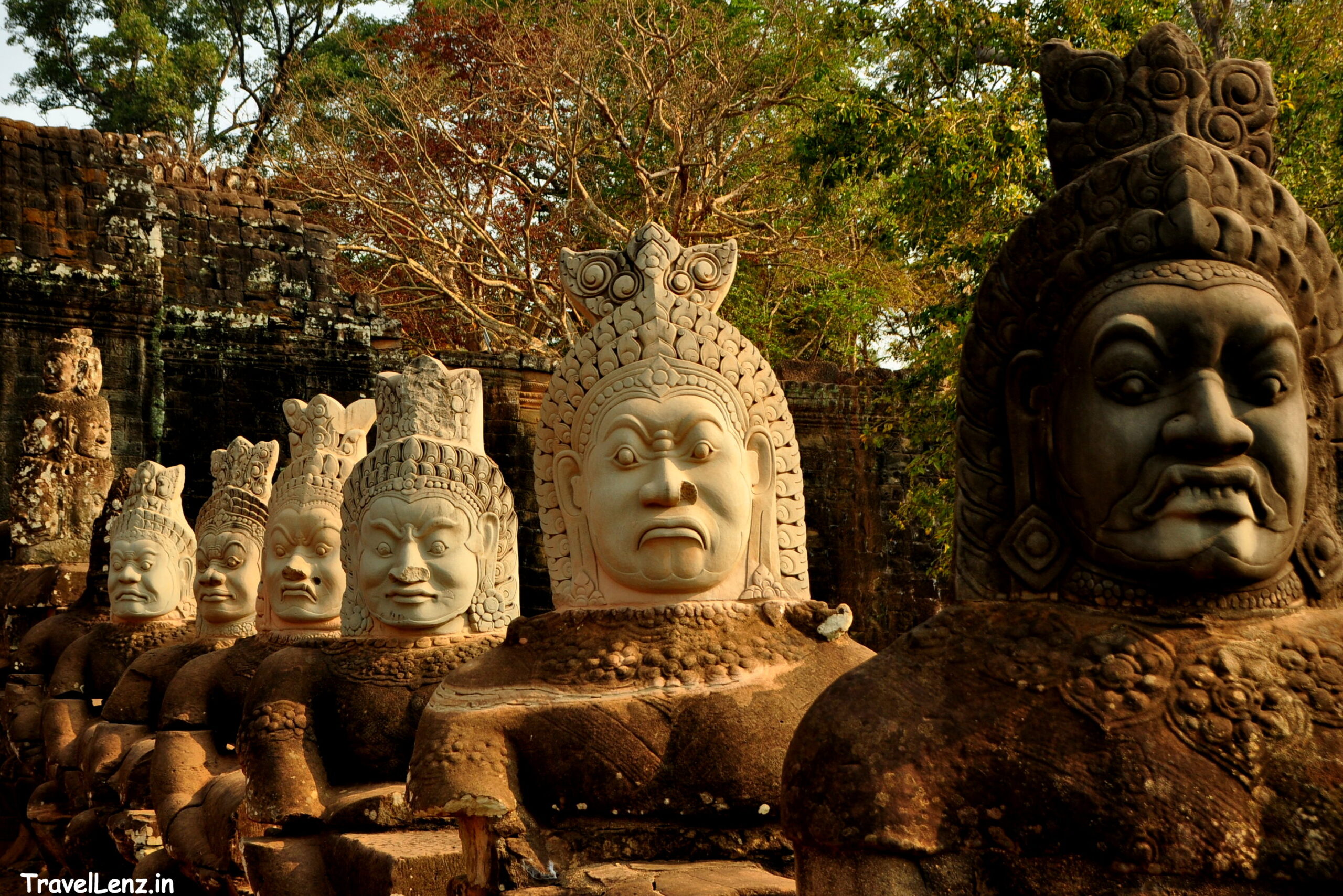 As we walked down the causeway we found that a lot of the heads had been restored and the stones looked structurally different from the lower parts of the statues. Tes mentioned that the original heads were destroyed or looted. Looting had become a profitable business in Cambodia after the Pot Pol era, and many statues were vandalised and their severed heads sold to collectors from abroad. A few of the recovered statues are now kept at the Angkor conservation museum.